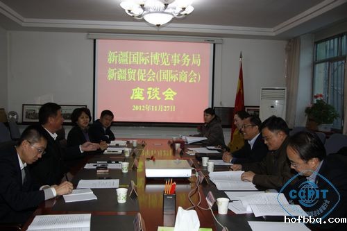 2012年11月27日,新疆国际博览事务局党组书记、局长李静援带领党组成员、副局长陈泳、局长助理夏娣娅•阿不拉海提及有关部室负责人来我会座谈,并就第三届“亚博会”有关工作进行商谈,我会党组书记、会长王克林,党组成员、副会长牛敏、吾买尔江•库尔班及各部室负责人参加了座谈。