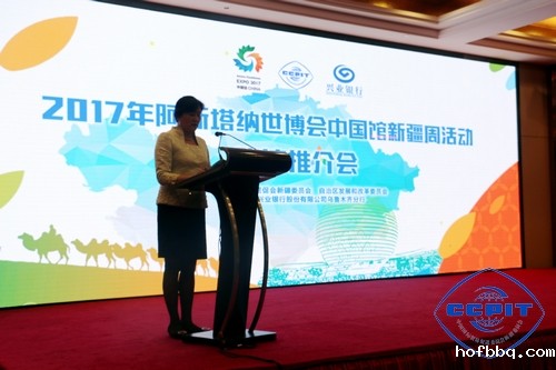 2017年5月12日,2017年阿斯塔纳世博会中国馆新疆周活动路演推介会(以下简称“路演推介会”)在乌鲁木齐顺利召开,此次路演推介会由新疆贸促会、自治区发改委主办,兴业银行乌鲁木齐分行承办。自治区发改委、自治区经信委、自治区招商发展局、自治区文化厅、自治区旅游委、自治区公安厅、自治区财政厅、自治区金融办、自治区商务厅、新疆贸促会、自治区出入境检验检疫局、自治区机电行办、纺织行办、轻工行办、石化行办、建材行办、乌鲁木齐市贸促会、乌鲁木齐职业大学等单位代表和哈萨克斯坦驻乌鲁木齐签证处、哈萨克斯坦中国贸易促进协会、兴业银行乌鲁木齐分行以及疆内企业等100余人出席了会议。会议由自治区商务厅党组成员、新疆贸促会党组书记、会长姚玉珍主持。