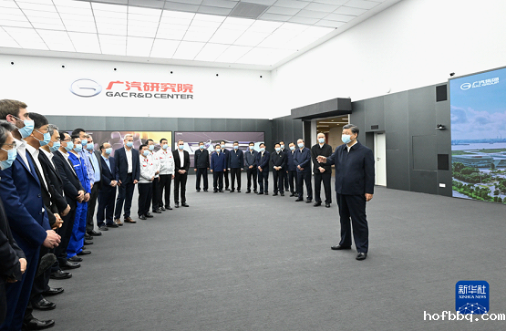 习近平随后来到广汽埃安新能源汽车股份有限公司考察。他走进企业展厅、总装车间、电池生产车间等,了解企业突破关键核心技术和推动制造业高端化、智能化、绿色化等进展情况。在广汽研究院,习近平仔细察看智能网联实验室、模型设计实验室等,并同科技人员、企业家、职工、外资企业代表等交流。习近平指出,中国改革开放政策将长久不变,永远不会自己关上开放的大门。一切愿意与我们合作共赢的国家,我们都愿意与他们相向而行,推动世界经济共同繁荣发展。习近平强调,中国是个大国,要重视实体经济,走自力更生之路。关键核心技术要立足自主研发,也欢迎国际合作。要加强教育和人才培养,夯实科技自立自强根基。